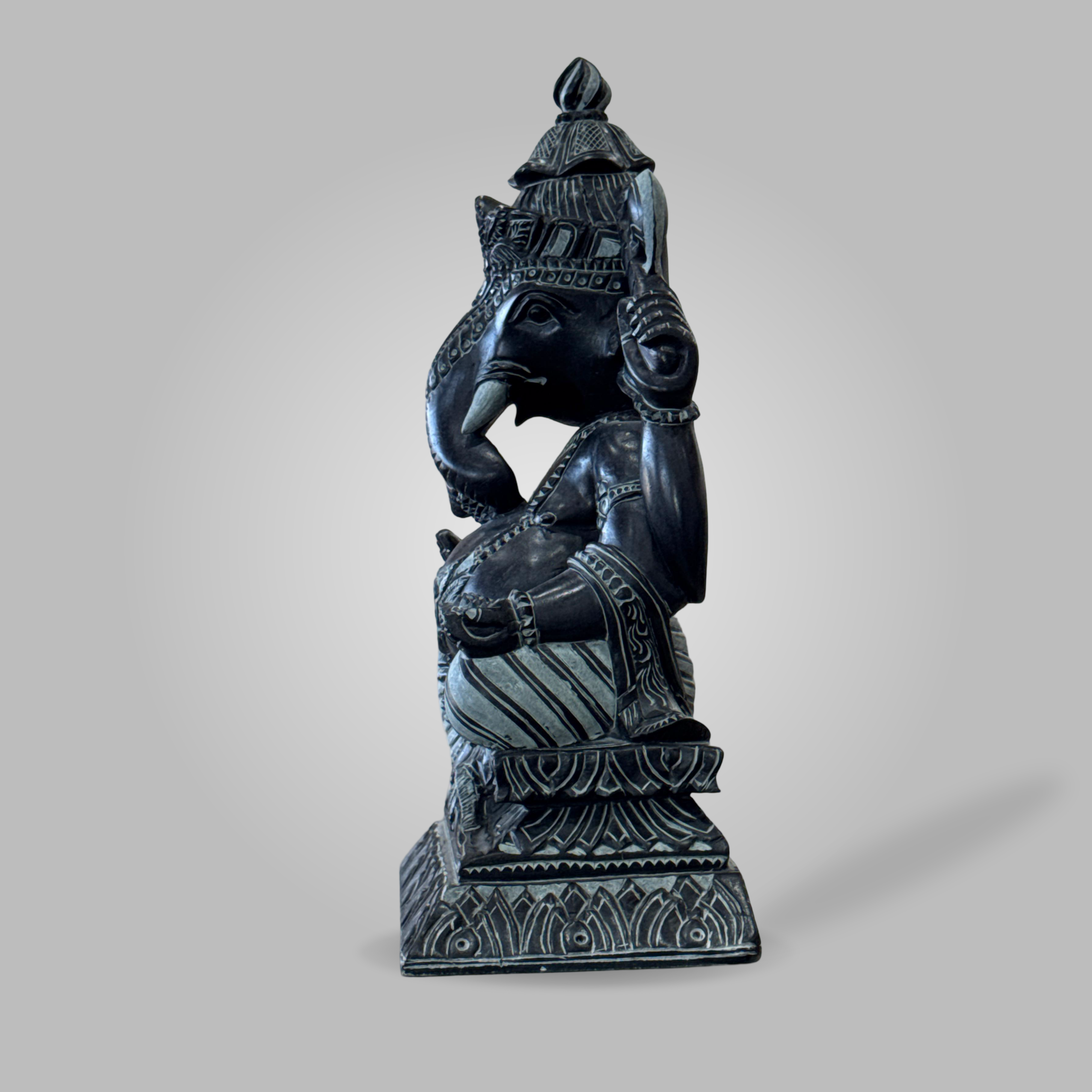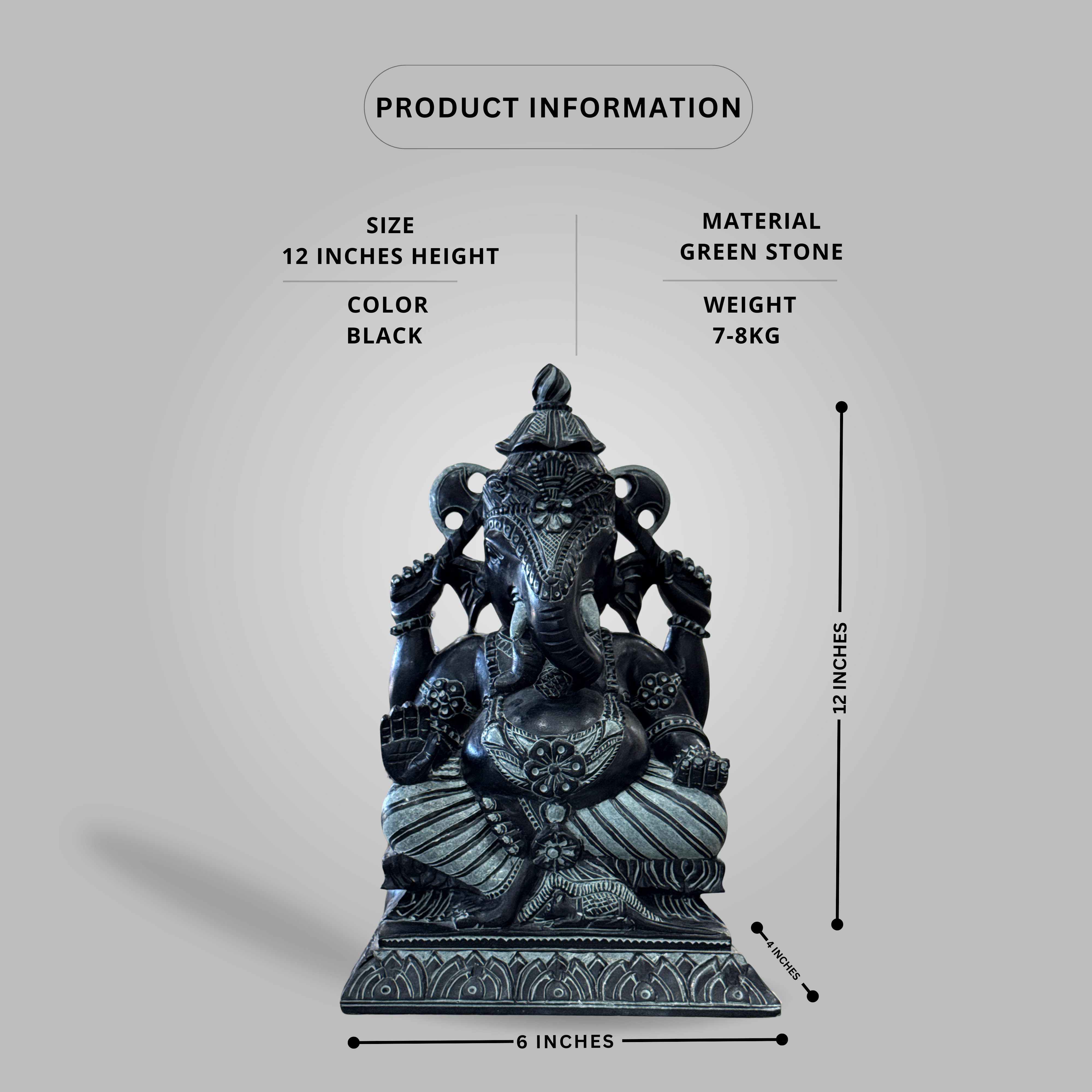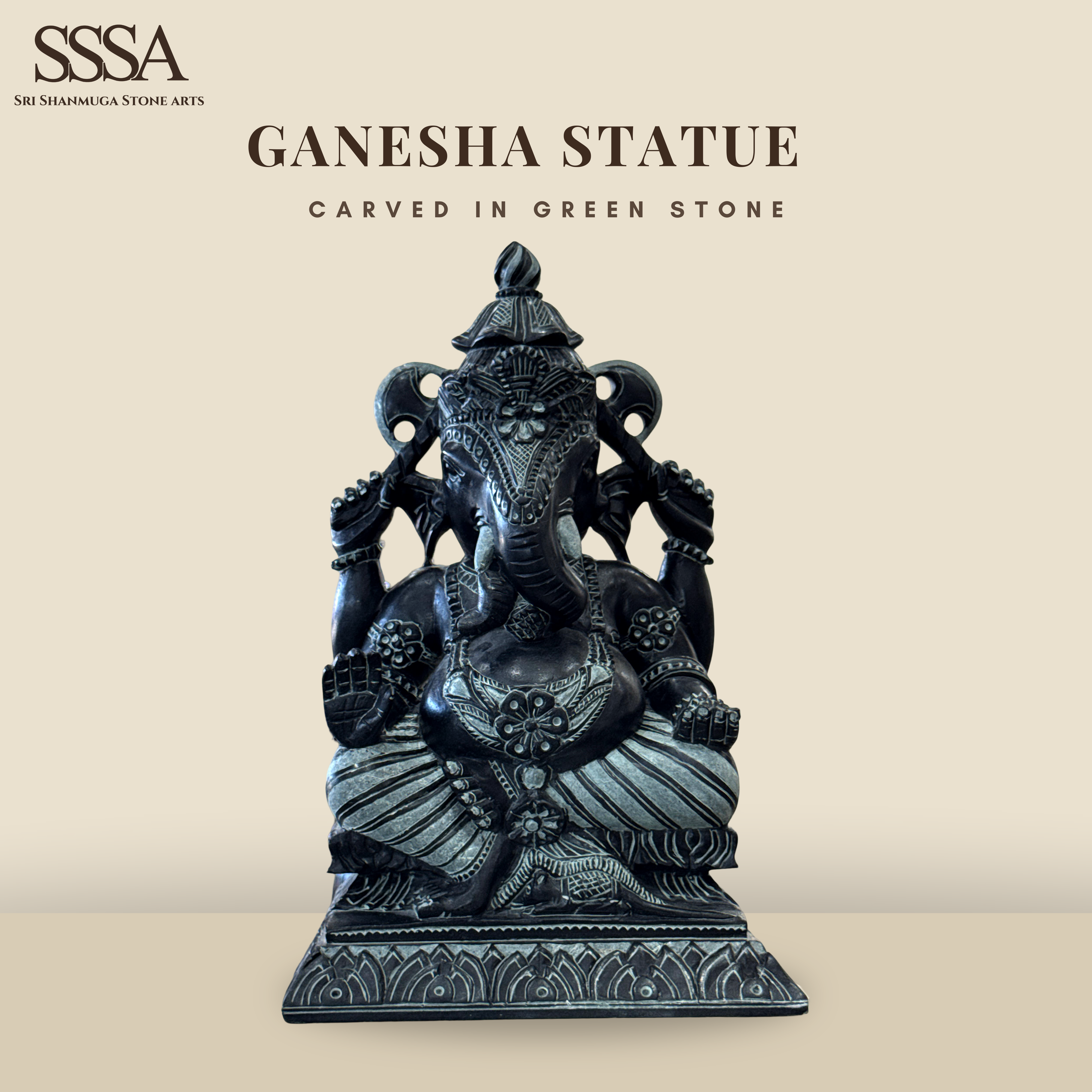 Bring home the divine presence with our handcrafted Black Green Stone Ganesha Statue. Expertly carved from natural green stone with a black finish, this statue is a symbol of wisdom, prosperity, and protection. Designed with intricate details, it serves as an ideal addition to home temples, meditation spaces, office environments, or as a meaningful gift for special occasions.